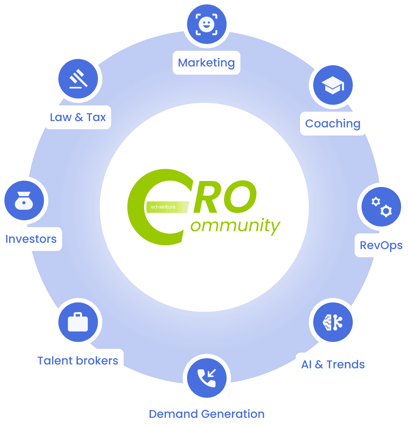 CROs can’t succeed alone. From Demand Gen and Recruiting to RevOps, Investors, Coaching, Legal, or HR – deep expert know-how and sparring are often missing, especially in startups and scaleups.